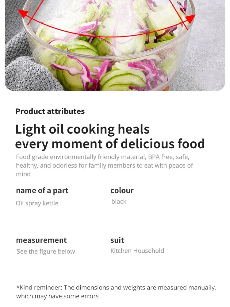 Suitable for kitchen cooking, frying steak, kebabs,vegetable salad, you can control the amount of oil